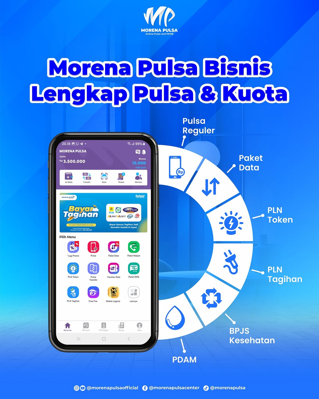 MORENA PULSA adalah merupakan salah satu Distributor & Agen Pulsa Murah All Operator lengkap PPOB dibawah Management CV. LEON PAYMENT SOLUSINDO yang sudah berpengalaman menjadi Distributor resmi pulsa murah All operator yang menawarkan peluang bisnis usaha pulsa, paket data, dll. Kamu bisa melakukan transaksi dengan aman, mudah, dan cepat dengan satu aplikasi saja. Dengan modal yang sangat kecil dan jaminan untung tinggi dengan resiko yang minim. Daftar sekarang di dapatkan keuntungan nya.